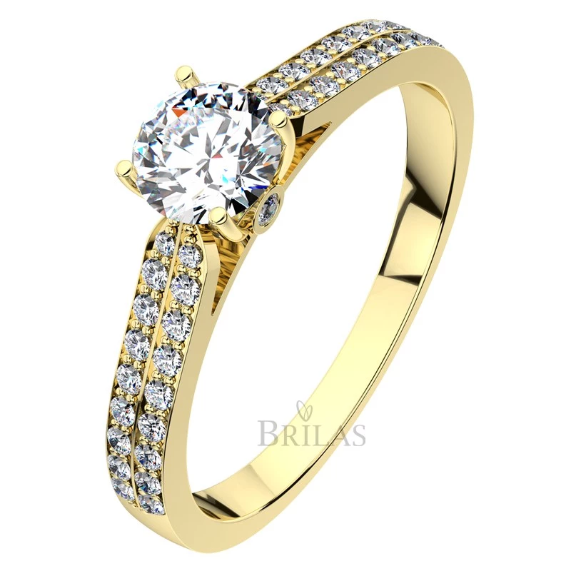 Přepychový zásnubní prsten ze žlutého zlata v nejnovějším designu. Jedná se o jedinečný a okouzlující kousek s precizním propracováním. Dokonalý prsten k tomu, aby se Váš významný životní krok stal opravdu tím nejkrásnějším. Zásnubní prsten, který zdobí jeden centrální briliant o velikosti o velikosti 4,75 mm nebo 5 mm či 5,25 mm spolu se dvěma menšími brilianty vsazenými po stranách o velikosti 1,1 mm. Prsten je pak ještě perfektně ozdoben 39‑ti briliant o velikosti 1,2 mm vsazených do dvou řad. Vybrat si můžete přírodní diamanty v kvalitě Si nebo laboratorní diamanty, které jsou laboratorně vytvořené diamanty, jejichž optické, chemické a fyzikální vlastnosti jsou naprosto totožné s klasickým diamantem. Disponují tedy stejnou krásou jako vytěžené diamanty. Diamanty jsou kvality VS a barvy E/F. Sbalit popis