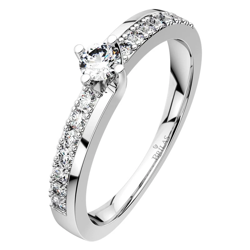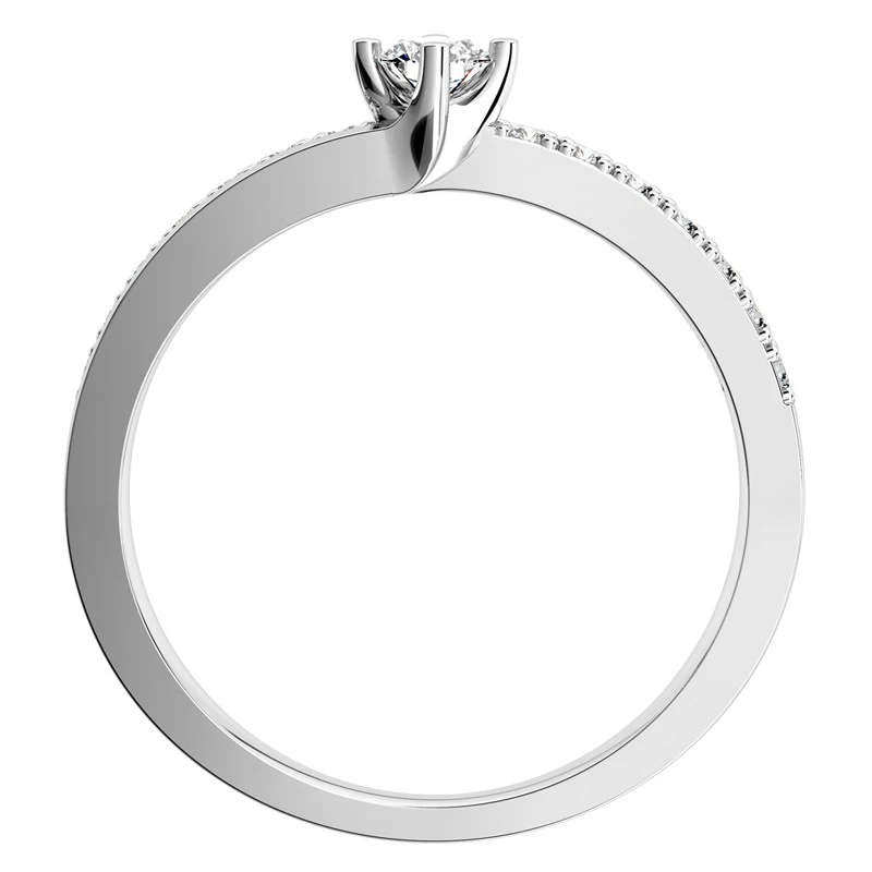Přepychový zásnubní prsten z bílého zlata v nejnovějším designu. Jedná se o jedinečný prsten s precizním propracováním. Zásnubní prsten, který zdobí jeden centrální briliant o velikosti 3,25 mm spolu se čtrnácti menšími brilianty vsazenými po stranách o velikosti 1,25 mm. Celková hmotnost briliantů je 0,28 ct. Sbalit popis