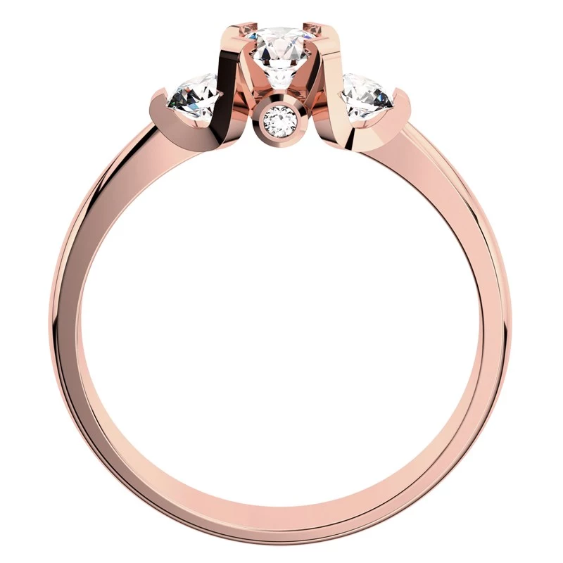 Tento prsten rozhodně nadchne každou ženu, která touží mít originální a netradiční zásnubní prsten a zdobit jím svou ruku po celý zbytek života. Zásnubní prsten Klára vyroben z červeného zlata zdobí 5 kamenů. Jeden o velikosti 4,25 mm a dva o velikosti 3,5 mm. Zbylé dva, které dodávají prstenu skvělý vzhled, mají velikost 1,5 mm a naleznete je z profilu prstene. Sbalit popis