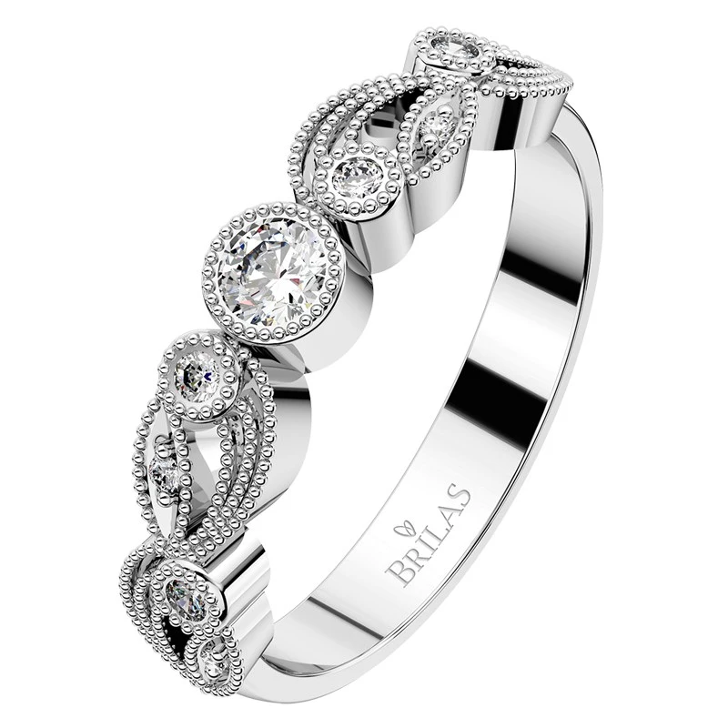 Zásnubní prsten Viva je vyroben z bílého zlata a je osazen brilianty o velikosti 3 mm, 4x1,5 mm a 4x1 mm ‑ celková hmotnost kamenů je 0,18 ct. Tento prsten je krásně zdobný a je velmi romantický, tak neváhejte! Sbalit popis