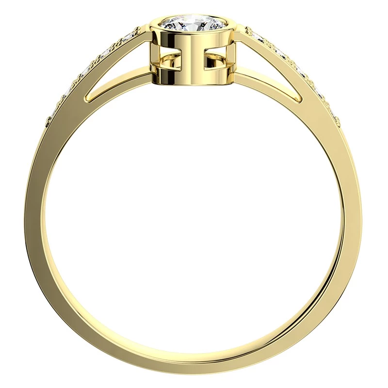 Zásnubní prsten Ida. Prsten, který na její ruce zaručeně nikdo nepřehlédne! Prstýnek, který je vyroben ze žlutého zlata je bez pochyb netradičním kouskem. Prstenu vévodí jeden centrální zirkon o velikosti 3,75 mm a poté je z každé strany doplněn 5‑ti dalšími zirkony o velikosti 1,25 mm. Sbalit popis